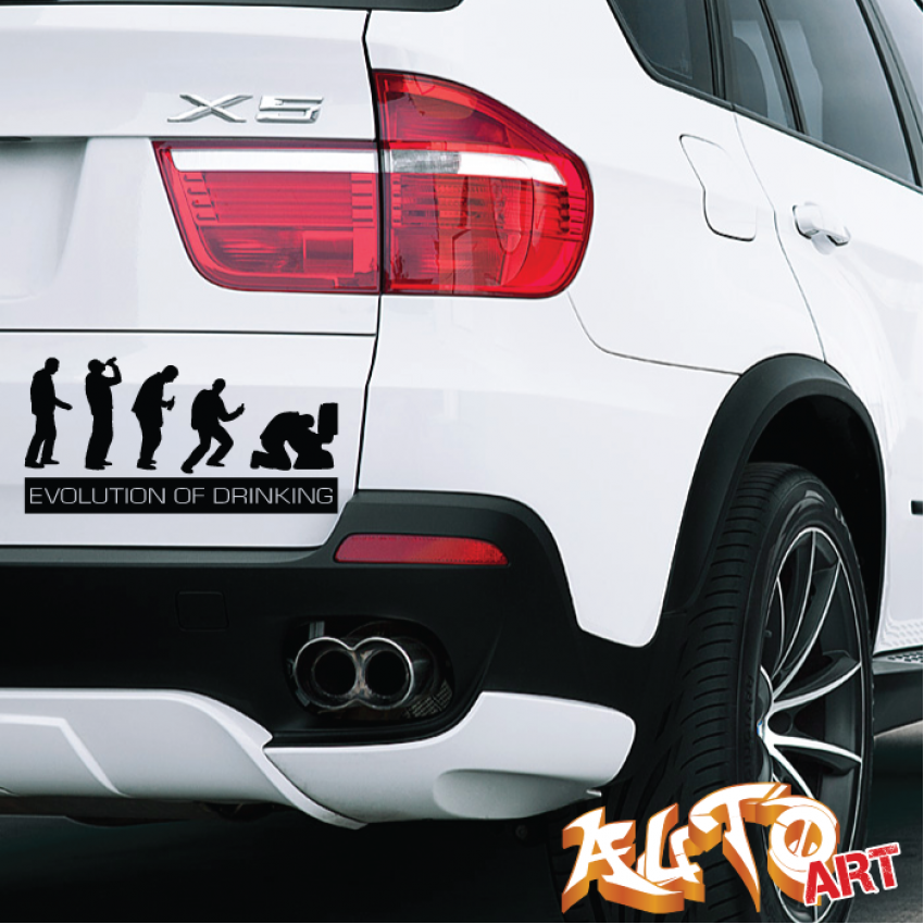 Виниловая наклейка «Evolution of Drinking» — яркий и смешной стикер, который в юмористичной форме изображает эволюцию человека, завершая её сценой с напитками.